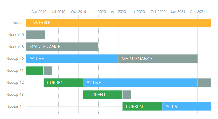 Major Node.js versions enter Current release status for six months, which gives library authors time to add support for them. After six months, odd-numbered releases (9, 11, etc.) become unsupported, and even-numbered releases (10, 12, etc.) move to Active LTS status and are ready for general use. LTS release status is "long-term support", which typically guarantees that critical bugs will be fixed for a total of 30 months. Production applications should only use Active LTS or Maintenance LTS releases.