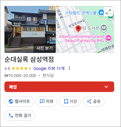 원래는 순대실록 삼성역점에 가려고 했는데, 이상하게 지도에 나오지 않더군요. 찾아보니 최근 폐점을 했다고 합니다. 11월까지 리뷰가 있는 걸 보면 11월에서 12월 사이에 폐점을 한 것 같네요. 점심에 웨이팅이 항상 있을 만큼 나쁘지 않았는데, 주말이나 저녁까지 그 분위기를 이어가지 못했나 보네요. 아니면 다른 사정이 있을 수도 있고.