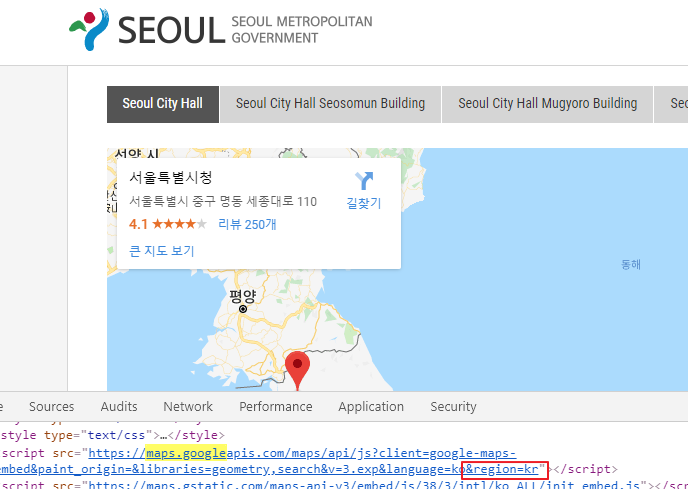 서울시의 경우에도 구글맵을 사용하지만, region 속성값을 "kr"로 지정해놓아서 "동해"로 표기됩니다. 근데, language 값도 "ko"로 박아넣어서 영문 페이지인데, 지도는 한국어로 보인다는~