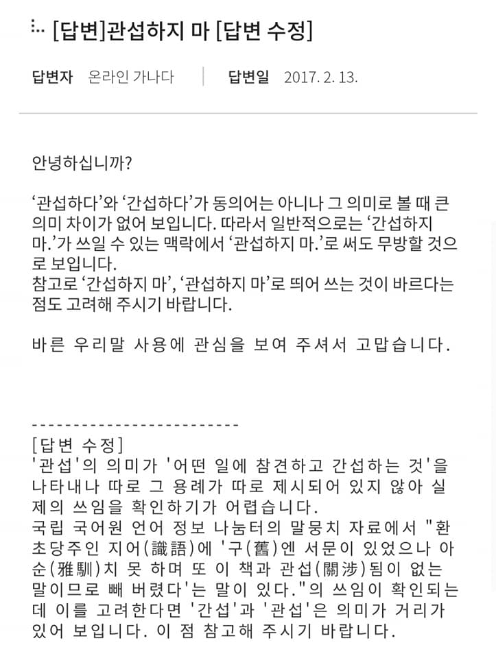 그리고 좀 더 찾아보니 관섭은 간섭과 의미상 같지는 않다라는 추가 답변이 달립니다.