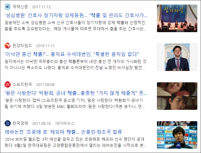 메신저로 대화를 하다가 "착출 되었답니다"라는 표현을 쓰고 나서 뭔가 느낌이 이상해서 사전을 찾아보니 "착출"이라는 단어는 없고 "차출"이 맞는 표현이라고 합니다. 다행스럽게도 신문기사에서도 "착출"이라는 표현을 간혹 쓰는 걸 보면 많이 틀리는 표현인가 봅니다.