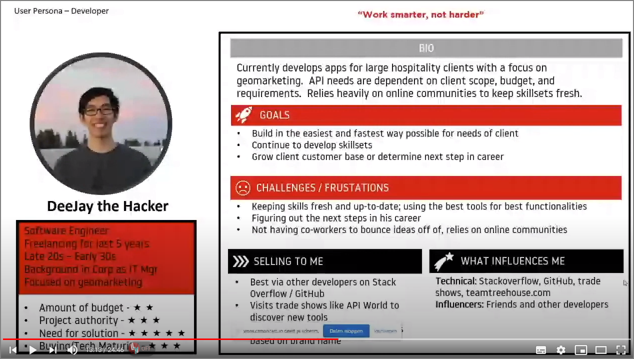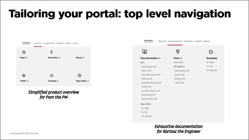 디테일하게 개발자 포털 내에서 API 문서를 페르소나 또는 독자에 대한 정의를 통해 세분화해서 만든 그런 이야기는 아니고 해커, 엔지니어, 스타트업 CEO, PM 4가지 유형에 페르소나를 만들고 그에 따라 콘텐츠를 제공한 수준에서 이야기를 합니다.