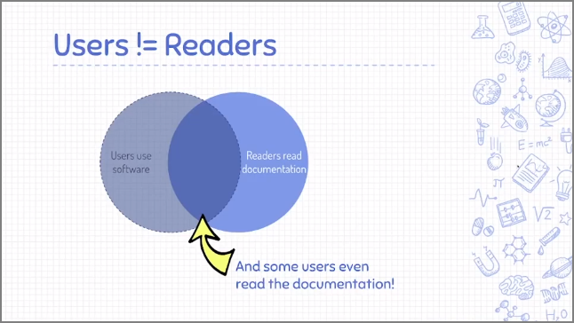 세션 중간에 나온 표 중에 독자에 대한 정의가 인상적이었습니다. 보통 "독자=사용자"라고 생각하기 쉬운데 사용자 중에서 문서를 읽지 않는 대부분을 제외해야 하고(물론 소프트웨어 문서는 보지 않고서 사용법을 알아낼 방법이 없기 때문에 대부분 문서를 보긴 합니다만) 사용자는 아니지만 문서를 보는 대상자(영업, 관리자 등등)도 있다는 겁니다. 때문에 실제 독자의 유형과 어떤 유형의 독자가 많은지 확인하고 그들에게 적절한 정보를 제공해야 한다는 것이지요.
