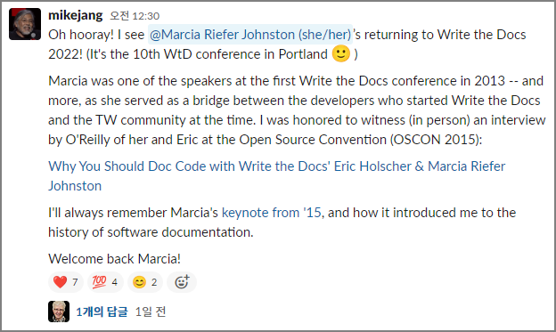 Google Docs Advocate Erin McKean가 Google's Season of Docs Program에 대한 이야기를 전하는 세션도 있구요. AWS Marcia Riefer Johnston가 docs as code를 어떻게 만들었고 앞으로 어떤 식으로 발전시켜나갈 것인가에 대한 이야기도 있습니다.