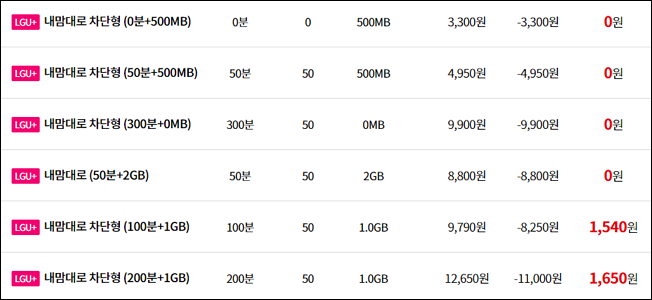 가입한 요금제는 "내맘대로 (50분+1GB)"이라는 상품입니다. 지금은 같은 상품이 없네요.