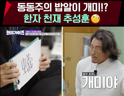 동동주를 한자로 부의주(浮蟻酒)라고 부르는데 여기서 "蟻"가 어떤 의미인지 맞추는 것입니다. 아마 제작진의 의도는 이 한자는 알기 어려우니 동동주의 이미지를 보고 맞추라는 것 같은데... 게스트로 출연한 추성훈이 한자의 의미를 알고 답을 그냥 맞혀 버립니다.