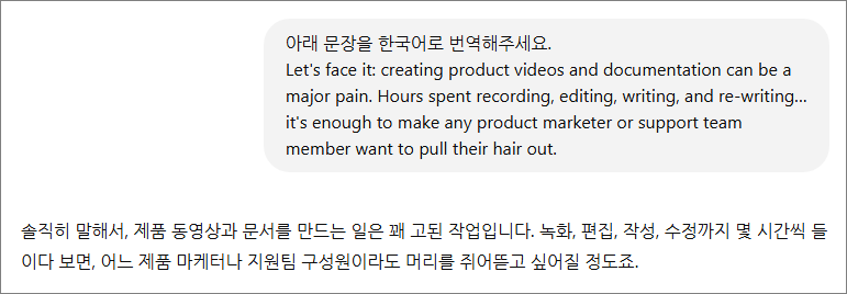 ChatGPT는 어떨까요? 특별한 프롬프트를 사용하지 않았음에도 정말 자연스럽게 번역을 해줍니다. 물론 원문에서 "..."을 사용하며 던지려고 했던 고충의 깊이까지 담지는 못했지만 말이죠.