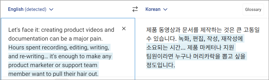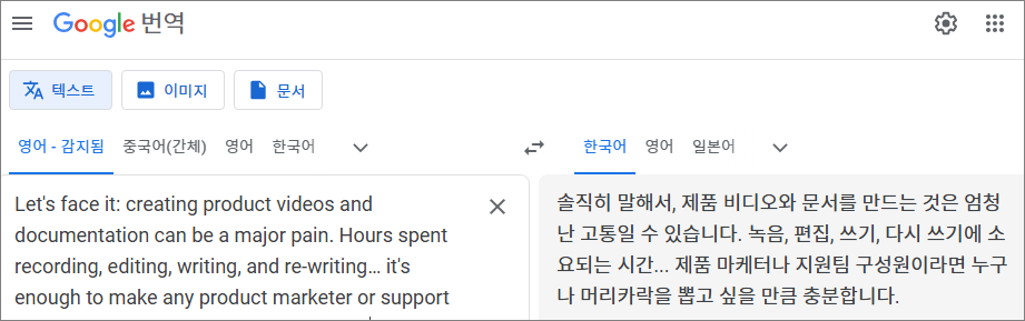 아래 이미지는 업무 프로세스를 촬영한 동영상을 제품 매뉴얼과 가이드 비디오로 자동 생성해 주는 솔루션에 대한 설명입니다. 첫 문장이 뭔가 어색하죠. 아마도 자동번역기를 사용한 모양입니다. 예전보다는 번역이 많이 좋아졌지만, 영어 문장 구성에 따라 이상한 번역이 나올 수 있습니다.