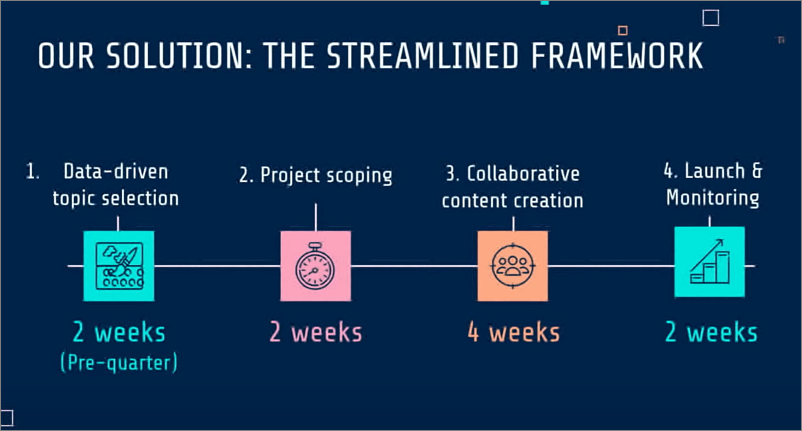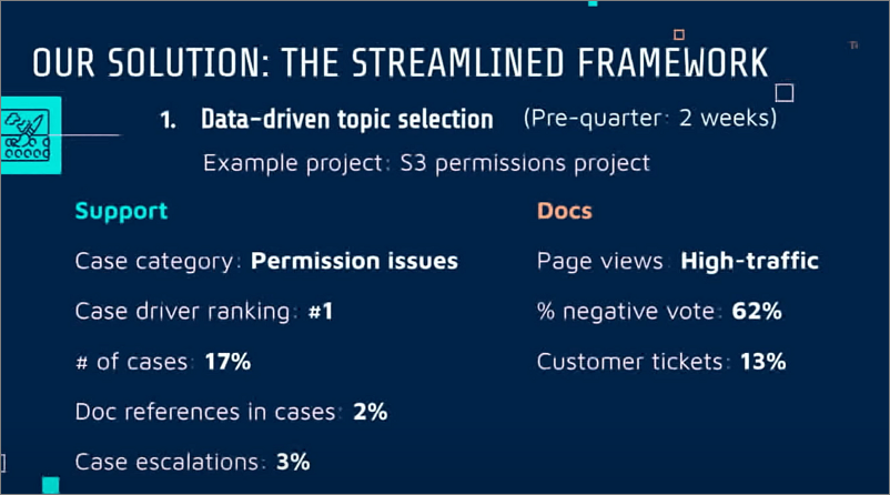 2021년부터 지원팀과 협업을 통해 해결책이 될 수 있는 프레임워크를 만들었습니다. 기존 업무 프로세스를 방해하지 않을 정도로(아마도) 분기 단위로 프로세스를 진행해 콘텐츠를 보완한다는 겁니다. 표에서는 10주로 나와있는데 실제는 한 명이 8시간 정도 사용하는 것이라고 하네요(아. 뒤의 이야기를 들어보니 8시간의 의미가 그게 아닐 수도 있겠네요).