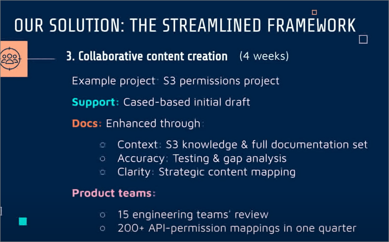 협업 프로세스를 보면 지원팀에서 기본적인 초안을 작성하고(이건 좀 독특하네요. 보통은 제품이나 구현 쪽에서 초안을 작성하는데, 이번 케이스의 경우 지원팀에서 어떤 식으로 고객 지원을 반복해서 한다는 내용이니깐), 문서팀에서는 초안을 보완합니다. 그리고 엔지니어링 쪽(15개 팀이라고 합니다. 일반적으로 그 많은 팀으로부터 피드백을 받는다는 것은 상상하기도 힘든 일이죠)에서 검토를 하는데 딱 필요한 내용만 확인할 수 있도록 문서팀에서 어느 정도 완벽한 세트를 만들어서 제공합니다. 이전에는 4개의 케이스만을 문서에 담았었는데 이제는 200여 개가 넘는 케이스에 적합한 내용을 문서에 담을 수 있었다고 합니다.