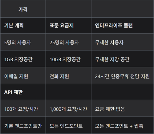 - API 제한: 요청 수 무제한, 모든 엔드포인트 및 웹훅 사용 가능
