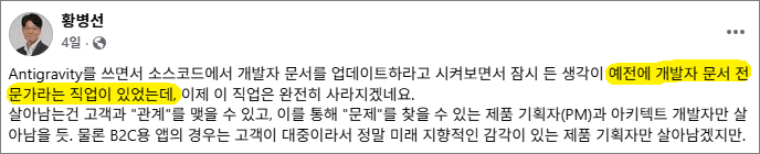 역시 페이스북 글입니다. Angel Lounge 공동 창업자 황병선 님의 글인데요, "개발자 문서 전문가"라는 직업을 과거형을 써서 살짝 가져와보았습니다. 물론 어떻게 해야 살아남을지에 대한 이야기가 더 중요한 부분이긴 하지만, "있었는데"라는 과거형에 상처를 받아서 ^^