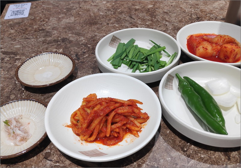 각 테이블에 있는 QR 코드를 찍어서 주문하는 방식입니다. 반찬은 뭐 기본으로 나오는데 개인적으로는 무생채가 맘에 들었습니다.