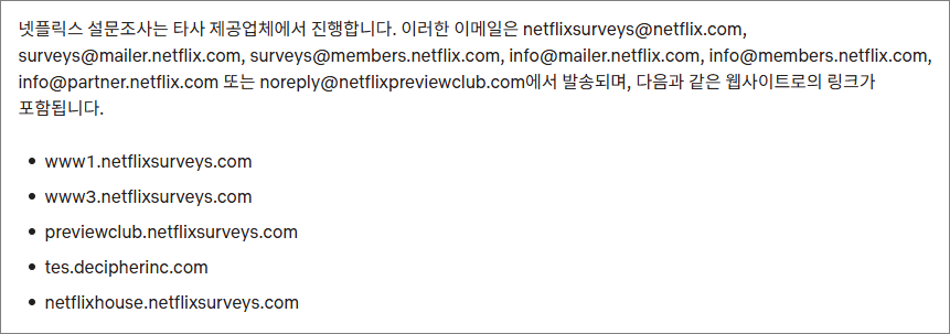하지만, 둘 다 도메인이 이상하거나 링크 클릭 시 넷플릭스처럼 보이는 사이트로 포워딩하는 방식이라 이번 설문 메일과는 다릅니다. 참고로, 넷플릭스에서는 공식적으로 설문 조사를 진행하고 있고, 설문 조사 시 사용하는 이메일 계정과 설문 조사 사이트 도메인을 공개하고 있습니다.