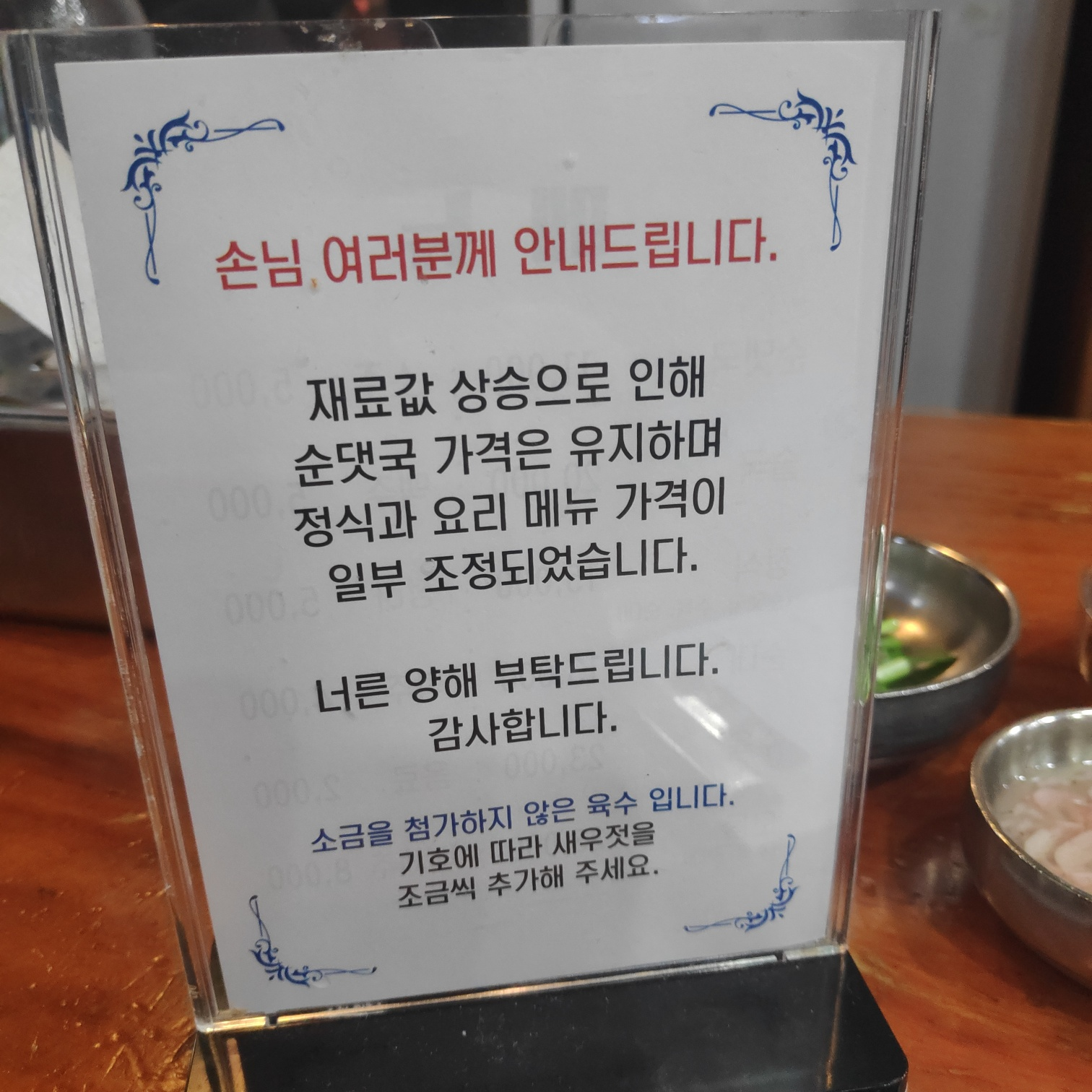 보통은 순댓국(특)이 있는데, 여기는 없습니다. 정식은 있지만 순댓국은 그냥 순대국이네요. 정식을 주문할까 하다가 정식 가격이 올랐다는 안내를 보고, 망설이다가 그냥 순대국을 주문했습니다. 옆자리에 정식을 주문한 것을 보니 4000원 차이가 날 정도는 아니지 않나 싶지만, 수육과 여러 종류의 순대가 궁금하다면 정식도 괜찮을 것 같네요.